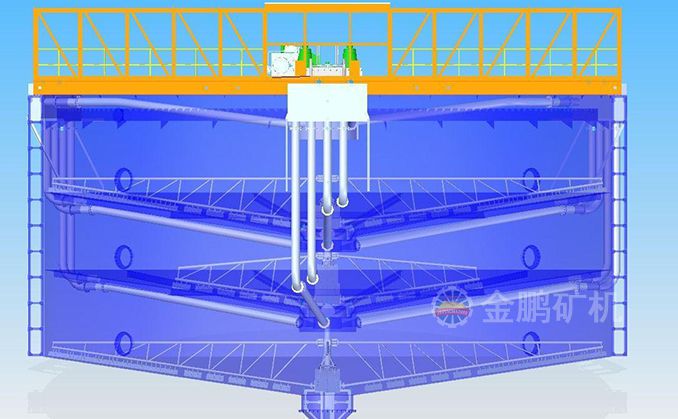 礦漿由給礦筒給入,自由沉降于耙子區(qū)的礦漿受刮板的壓力進(jìn)一步濃縮,由耙子逐漸刮向池子中心,由排礦口靠重力排入下一層池子?清水經(jīng)分配箱進(jìn)入最下層對(duì)物料進(jìn)行最后的洗滌,最下層的溢流返回分配箱進(jìn)入第二層對(duì)物料進(jìn)行洗滌,第二層的溢流返回分配箱進(jìn)入第一層對(duì)物料進(jìn)行洗滌,第一層的溢流經(jīng)溢流堰排出,經(jīng)三次洗滌的物料經(jīng)底部排出。