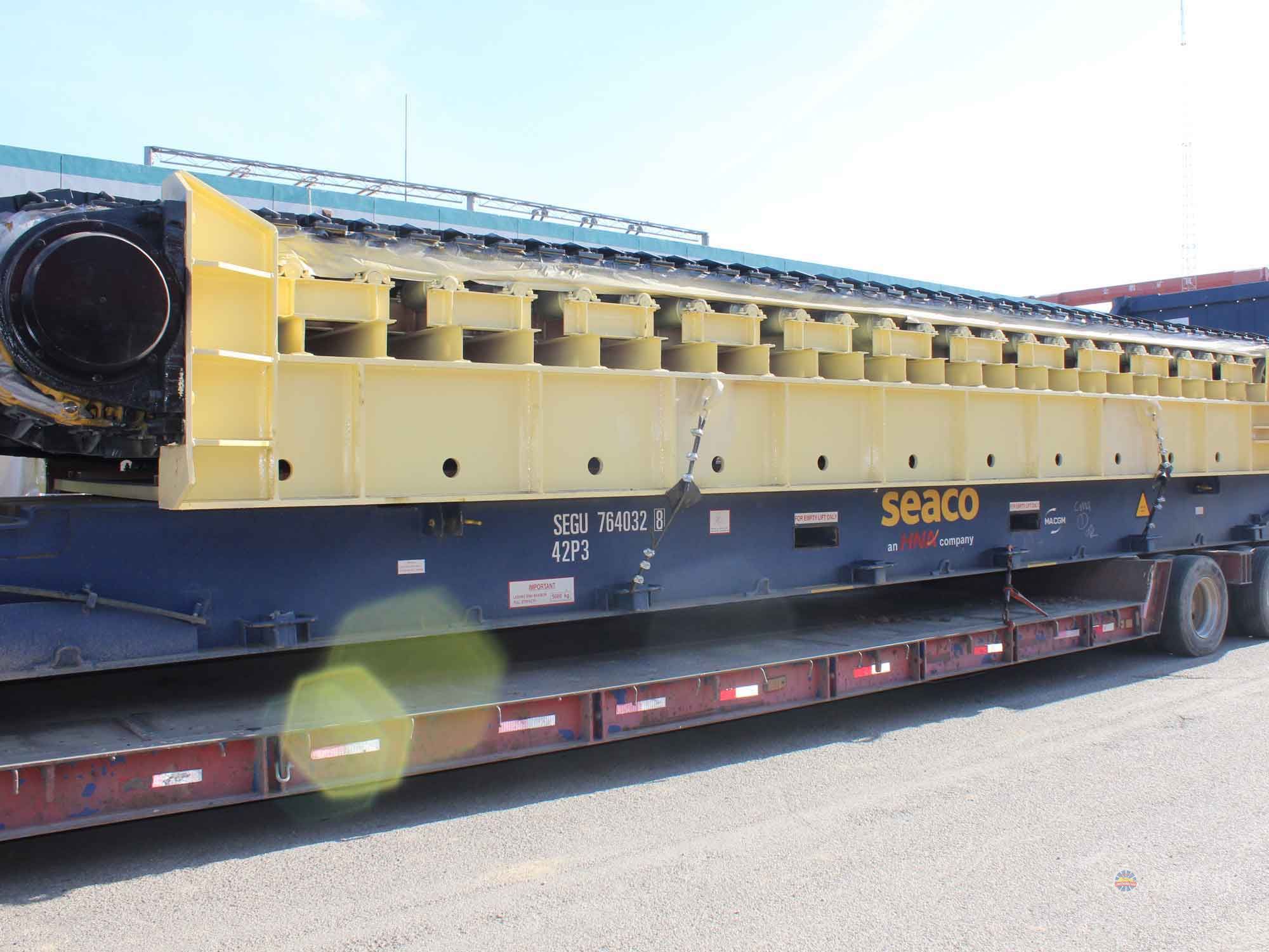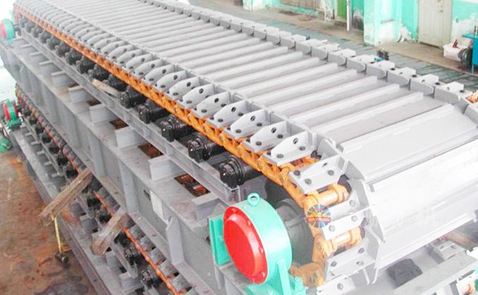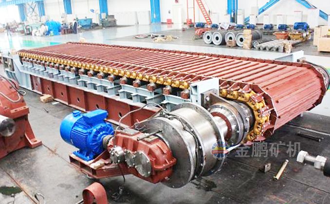 采用節(jié)距為200mm的高強(qiáng)度模鍛鏈條為牽引件,兩根鏈條繞過(guò)安裝在機(jī)體頭部的一對(duì)驅(qū)動(dòng)鏈輪和機(jī)體尾部的一對(duì)張緊輪聯(lián)成封閉形回路,在兩排鏈條的每個(gè)鏈節(jié)上裝配了相互交迭的、重型結(jié)構(gòu)的輸送槽而成為一個(gè)連續(xù)的能夠運(yùn)載物料的輸送線路。其自重和物料的重量由安裝在機(jī)體上的多排支重輪、鏈托輪和滑道梁支承。傳動(dòng)系統(tǒng)經(jīng)交流變頻調(diào)速電動(dòng)機(jī)聯(lián)接減速機(jī),再由漲套與驅(qū)動(dòng)裝置直聯(lián)驅(qū)動(dòng)運(yùn)載機(jī)構(gòu)低速運(yùn)行。將尾部料倉(cāng)卸入的物料沿輸送線路運(yùn)至機(jī)體的前方排出,實(shí)現(xiàn)向下方的工作機(jī)械連續(xù)均勻喂料的目的。