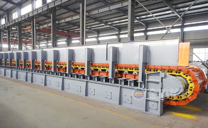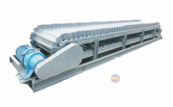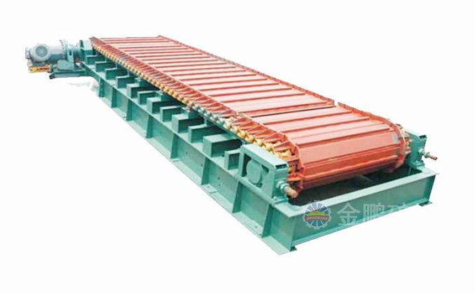 采用節(jié)距為150mm的高強(qiáng)度模鍛鏈條為牽引件,兩根鏈條繞過安裝在機(jī)體頭部的一對(duì)驅(qū)動(dòng)鏈輪和機(jī)體尾部的一對(duì)張緊輪聯(lián)成封閉形回路,在兩排鏈條的每個(gè)鏈節(jié)上裝配了相互交迭的、輕型結(jié)構(gòu)的輸送槽而成為一個(gè)連續(xù)的能夠運(yùn)載物料的輸送線路。其自重和物料的重量由安裝在機(jī)體上的多排支重輪、鏈托輪和滑道梁支承。傳動(dòng)系統(tǒng)經(jīng)交流變頻調(diào)速電動(dòng)機(jī)聯(lián)接減速機(jī),再由漲套與驅(qū)動(dòng)裝置直聯(lián)驅(qū)動(dòng)運(yùn)載機(jī)構(gòu)低速運(yùn)行。將尾部料倉(cāng)卸入的物料沿輸送線路運(yùn)至機(jī)體的前方排出,實(shí)現(xiàn)向下方的工作機(jī)械連續(xù)均勻喂料的目的。