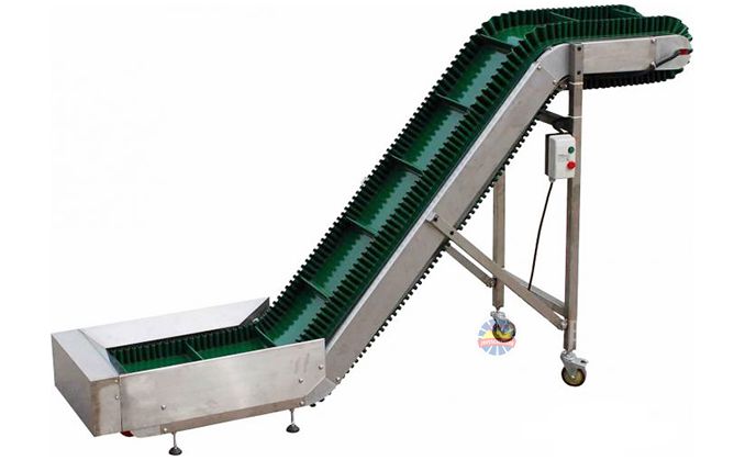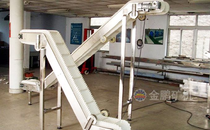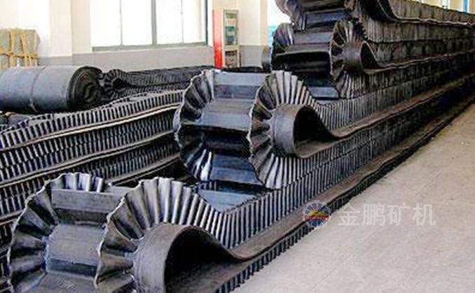 波狀擋邊輸送帶中以大傾角波狀擋邊輸送帶最有名,大傾角波狀擋邊輸送帶又叫裙邊隔板輸送帶,是由基帶、擋邊、橫隔板3部分組成。擋邊起防止物料測滑撒落的作用。為便于繞過滾筒,檔邊設(shè)計(jì)成波紋狀;橫隔板的作用是承托物料,為了實(shí)現(xiàn)大傾角輸送,采用T型TC型。檔邊和橫隔板是用二次硫化的方法與基帶連接的,具有很高的連接強(qiáng)度。