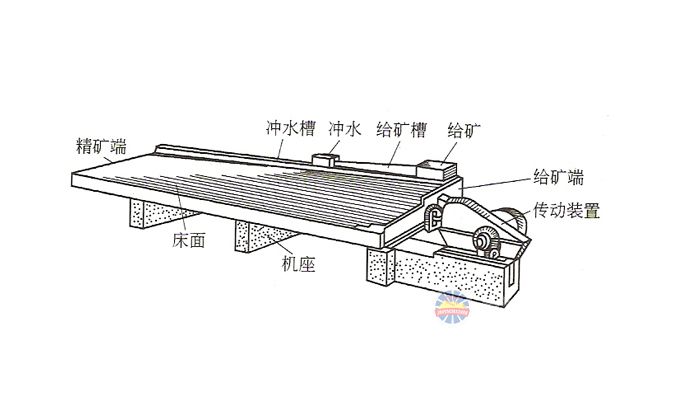 搖床分選是在床面和橫向水流的共同作用下實(shí)現(xiàn)的,床面上床條或刻槽是縱向的,與水流方向近于垂直,水流橫向流過時(shí)在溝槽內(nèi)形成渦流,渦流和床面搖動(dòng)的共同作用可使礦砂層松散并按密度分層。